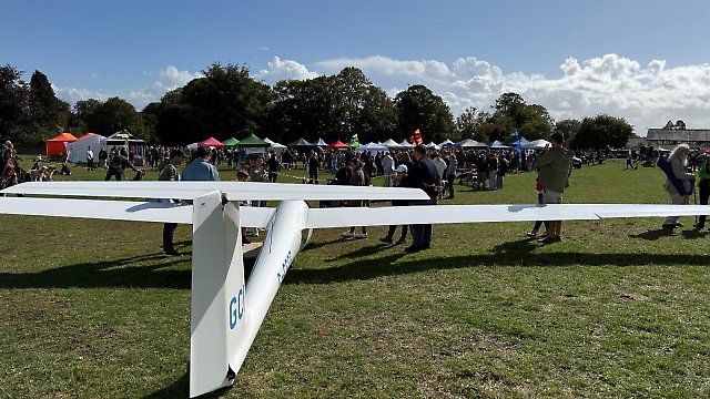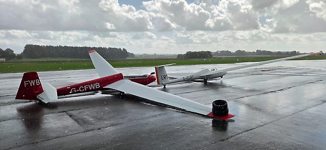 Flying stopped at lunchtime due to a large shower, the photos contrasting with the great day a few minutes earlier. Watching the weather radar let us time the next period of flying for a couple of hours, getting the rest of the flying list done, before sheltering for another shower and drying off the gliders afterwards as it cleared to put them away.
